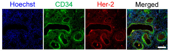 HER2/neu vascular expression in human ovary. Ovaries were fixed, paraffin-embedded and serially sectioned for immunofluorescence. Representative fluorescence images of ovary co-stained against CD34 (green) and Her-2 (Red). Bar = 100 µm.