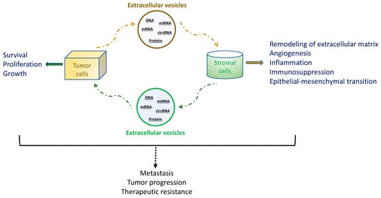 Tumor-derived EVs are emerging as critical cell-to-cell mediators in promoting not only survival and growth of the primary tumor but also its progression and metastasis. They play an important role in intercellular communication between tumor cells and stromal cells in local and distant microenvironments [57]. Tumor-derived EVs have been shown to promote release of cancer cells into the circulation and their distant spread through communication with neighboring non-tumor cells and exerting complex effects in the primary tumor microenvironment. These include EVs-induced remodeling of the extracellular matrix, promotion of angiogenesis and inflammation, immunosuppression and protection of tumor, and epithelial–mesenchymal transition. The circulating tumor-secreted EVs are delivered to the target organ, in which tumor EVs induce the recipient cells to express cytokines that mediate activation and remodeling of stromal cells and recruitment of bone marrow-derived cells to the premetastatic niche. Ultimately, these EVs-mediated multistep processes lead to tumor progression and metastasis (Figure 1).