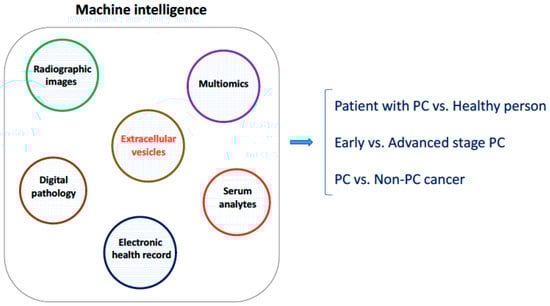 For mass screening of asymptomatic individuals, circulating EV-based biomarkers with high positive predictive value and low false positive or negative value will be essential. To detect PC at its earliest stages in patients with or without symptoms, highly sensitive EV-based biomarkers specific to pancreatic cancer (as compared to other types of cancer) are indicated. Combination of EV-based biomarkers and serum analytes such as protein and miRNA is important to develop a molecular signature for diagnosis of PC. Machine learning-based algorithms for integrative analysis of circulating EV-derived biomarkers along with digitized images, multiomics, clinical datasets, and population health are expected to advance detection of PC (Figure 2). Affordable cost, efficient testing, and validation in large multisites clinical studies will be necessary for development of effective screening modality that utilizes EV-based biomarkers for early detection and diagnosis of PC.