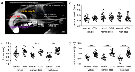 3.3. Effects of Cetirizine and OTM on Cranial Growth, Root Torque and Anterior Movement.
