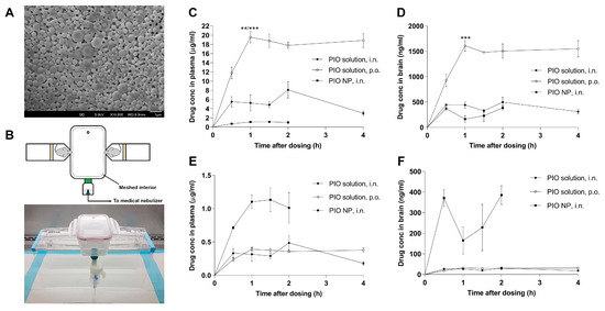 (A) Field emission scanning electron microscopy (FESEM) image of Pioglitazone (PIO)-loaded poly(lactic-co-glycolic acid) (PLGA) nanoparticles emulsified by D-α-Tocopherol polyethylene glycol succinate (TPGS). (B) Schematic diagram and photograph of the assembled inhalation system. (C) PIO concentrations versus time plots for plasma samples harvested from mice given PIO solution (●, 5 mg/kg, i.n., nasal instillation), PIO solution (○, 15 mg/kg, p.o.) and PIO NP (■, estimated 0.3 mg/kg, i.n., inhalation), respectively. (D) PIO concentrations versus time plots for brain samples. (E,F) Dose-normalized PIO concentrations versus time plots for plasma and brain samples, respectively, for comparison. Data are represented as mean ± SE with N = 3–4 C57BL/6 mice sacrificed per time point. ** indicates p < 0.01; *** indicates p < 0.001 when compared against the Cmax points of the other treatment groups.