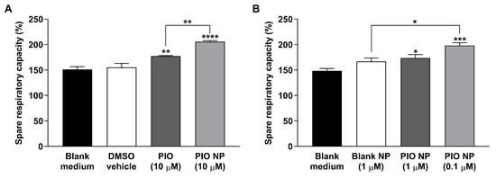 Next, we investigated whether 10 μM of our nanoparticulate drug formulation had any effect on mitochondrial respiratory activity in CHO-APP695 cells using extracellular flux analysis. The same concentration of PIO has been shown to elicit therapeutic responses in in vitro experiments [38]. The vehicle 0.2% DMSO used for the PIO solution was confirmed not to affect mitochondrial respiration significantly, hence, all treatment groups were compared to the blank culture medium control for uniformity. After discounting non-mitochondrial respiration, CHO-APP695 cells pre-treated with 10 μM PIO and 10 μM PIO NP were both found to exhibit significantly increased reserve respiratory capacity compared to the blank control (Figure 2A). Pre-treatment with 10 µM PIO solution showed a significantly higher spare respiratory capacity of 177.24 ± 1.19 percent as compared to the control’s spare respiratory capacity of 151.10 ± 5.38 percent (adjusted p = 0.0083). Significantly higher reserve respiratory capacity was also observed for cells pre-treated with 10 µM PIO NP (205.82 ± 1.70 percent, adjusted p < 0.0001). Specifically, pre-treatment with 10 µM PIO NP was found to significantly increase the reserve respiratory capacity of CHO-APP695 cells even more than cells pre-treated with 10 µM PIO solution (adjusted p = 0.0041).