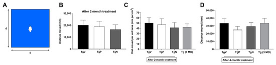 Upon conclusion of the entire 4-month treatment schedule, the open field test was repeated for Tg2576 mice in the 3 treatment groups (A), (B), and (C) with a 50 cm × 50 cm open field cage. Locomotor activity was video-recorded and analyzed using TopScan. Animal activity was compared in terms of total distance moved.