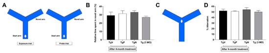 (A) Schematic representation of setup for the forced alternation in the Y-maze. (B) Time spent in the novel arm during the probe trial. Tg2576 mice (7-month-old) in the TgP and TgN groups had completed their 4-month treatment schedule with age-matched oral vehicle-treated mice in the TgV group. (C) Schematic representation of setup for the spontaneous alternation in the Y-maze. (D) Percent alternation in the three free arms. Data are represented as mean ± SE.