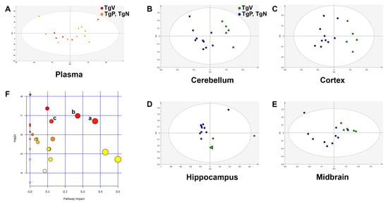 Principal component analysis (PCA) scores plots of metabolic profiles for the reference group (TgV, oral vehicle-treated Tg2576 mice) and pooled drug treatment groups (TgP, oral PIO-treated Tg2576 mice; TgN, PIO NP inhalation-treated Tg2576 mice) for (A) plasma, (B) cerebellum, (C) cortex, (D) hippocampus, and (E) midbrain matrix, respectively. (F) Pathway analysis overview with each node representing an altered metabolic pathway in the cortex of the pooled drug treatment groups versus the reference group. The three most relevant pathways are: (a) Alanine, aspartate, and glutamate metabolism; (b) glycine, serine, and threonine metabolism; (c) arginine and proline metabolism. The more upstream the metabolite is in the pathway, the higher impact value it will derive (x-axis), whereas the more number of ‘hits,’ i.e., metabolites affected in that biological pathway, the more important the pathway seems to be (y-axis).