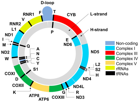 The light (L) and heavy (H) strands of mtDNA differ in their base composition [33]: The L-strand is rich in cytosines, while the H-strand is rich in guanines. The L-strand contains eight genes of tRNA and the gene of NADH-ubiquinone oxidoreductase chain 6 protein (ND6). Twenty eight other genes are located on the H-strand. They encode 14 tRNAs, two rRNAs (12S and 16S rRNA), and 12 polypeptides involved in electron transport and oxidative phosphorylation: Six subunits of the NADH-ubiquinone oxidoreductase complex (ND1, ND2, ND3, ND4, ND4L, ND5), one subunit (cytochrome b; CYB) of the cytochrome bc1 complex, three subunits of the cytochrome c oxidase complex (COXI, COXII, COXIII), and two subunits of the ATP synthase complex (ATP 6 and ATP8) (Figure 1).