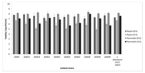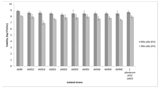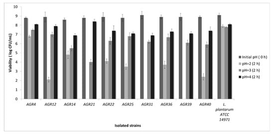 Kefir grains represent a complex culture that has been used in various fermentation processes [20,28]. Kefir grains are rich in potentially probiotics microorganisms [29], and are shown to exhibit significant health-promoting effects [16,17]. In the present study, 10 LAB strains were isolated from kefir grains and in vitro screening for probiotic properties was performed. Firstly, evaluation of their resistance to low pH was performed. L. plantarum 14,917 served as a reference strain [20] (Figure 1). At pH 4, all strains had high survival rates. Nevertheless, a significant reduction of cell viability was noted in most tested LAB strains at pH 2. However, AGR 4 maintained high survival rate in high levels (6.8 log CFU/mL). This is an important finding as a probiotic strain should persist at pH 3.0 or even lower [20].