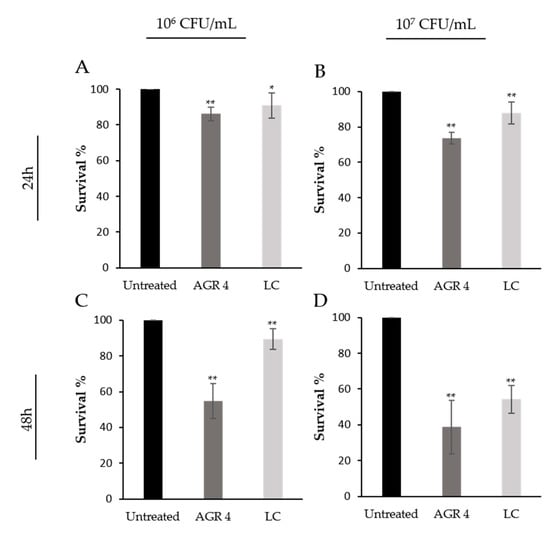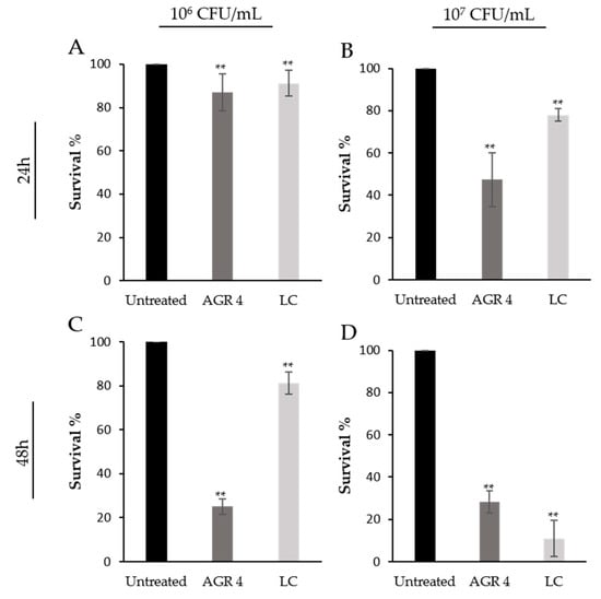 Time- and dose-dependent antiproliferative effects of viable Lactobacillus AGR 4 on A375 cells, measured by SRB assay. The human melanoma cell line, A375, was incubated with 106 CFU/mL (A,C) or 107 CFU/mL (B,D) of Lactobacillus AGR 4 for 24 (A,B) and 48 h (C,D). Lactobacillus casei (LC) ATCC 393 served as a reference strain. Data is presented as the mean ± standard deviation of three independent experiments. ** p < 0.01 compared to untreated cells.