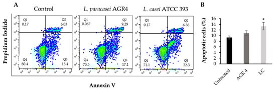 Assessment of the pro-apoptotic potential of L. paracasei AGR 4 via flow cytometry. HT-29 cells were co-incubated with 107 CFU/mL of Lactobacillus AGR 4 or L. casei ATCC 393 (LC) for 48 h. Untreated cells incubated with culture media were used as control. (A) Representative flow cytometry scatter plots. Q4: live cells; Q3: early apoptotic cells; Q2: late apoptotic cells; Q1: dead cells and debris. The percentage of cells in each quadrant is also shown. (B) Quantitative analysis of two independent experiments. * p < 0.05 compared to the untreated cells.