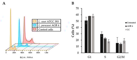Assessment of the effect of L. paracasei AGR 4 in HT-29 cell cycle progression via flow cytometry. HT-29 cells were incubated with L. paracasei AGR 4 or L. casei ATCC 393 (LC) at a density of 107 CFU/mL for 48 h. Cells treated with sterile culture media were used as a control. (A) Representative flow cytometry plot. (B) Quantitative analysis of two independent experiments.