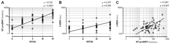 To confirm that NYHA class progression was paralleled by increases in NT-proBNP and LVEDV, we evaluated the correlations between NYHA class and these two HF severity indexes. Our analysis showed highly positive correlations between NYHA class and NT-proBNP (Figure 1A; ρ = 0.732, p < 0.001) or LVEDV (Figure 1B; ρ = 0.377, p < 0.005), indicating a proper CHF patient allocation for disease severity and the expected relationships between functional status, NP levels, and LV remodeling. Indeed, there was a significant correlation between LVEDV and NT-proBNP (Figure 1C; r = 0.361, p < 0.01).