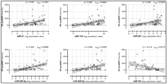 Circulating miRNAs associated with NT-proBNP plasma concentration. Five miRNAs showed positive associations, whereas one miRNA was negatively associated with NT-proBNP levels. Analyses were adjusted for age, sex, diabetes mellitus, hypertension, hypercholesterolemia, and smoking habit. Trendlines are depicted along with the 95% confidence interval (light gray). padj = p-values corrected for multiple testing; n = 61.