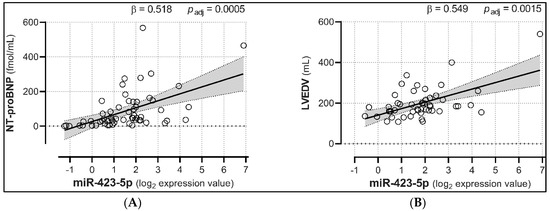 Expression levels of plasma miR-423-5p are associated with both NT-proBNP and LVEDV. HF-regulated miR-423-5p showed positive associations with both NT-proBNP (A) and LVEDV (B). Analyses were adjusted for age, sex, personal history of diabetes mellitus, hypertension, and/or hypercholesterolemia, and smoking habit. Trendlines are depicted along with the 95% confidence interval (light gray). padj = p-values corrected for multiple comparisons; n = 61.