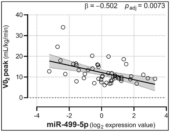 Expression levels of plasma miR-499-5p are associated with the VO2 peak. HF-regulated miR-499-5p showed a negative association with VO2 peak levels. Analyses were adjusted for age, sex, personal history of diabetes mellitus, hypertension, and/or hypercholesterolemia, and smoking habit. Trendlines are depicted along with the 95% confidence interval (light gray). padj = p-values corrected for multiple comparisons; n = 61.