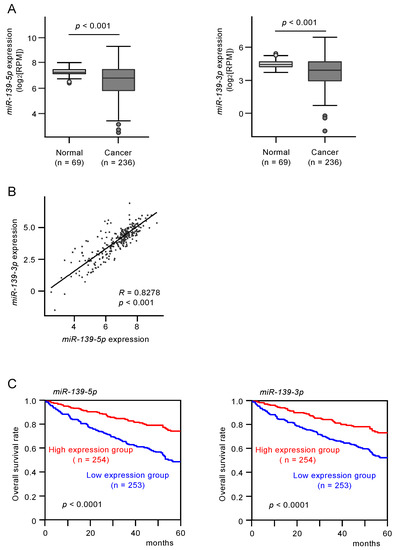 The expression and clinical significance of miR-139-5p and miR-139-3p in renal cell carcinoma (RCC) clinical specimens. (A) Expression of miR-139-5p and miR-139-3p were significantly reduced in The Cancer Genome Atlas—Kidney Renal Clear Cell Carcinoma (TCGA-KIRC) cancer specimens compared with adjacent normal specimens (p < 0.001). (B) Spearman’s rank test showed positive correlations between the expression levels of miR-139-5p and miR-139-3p in TCGA-KIRC clinical specimens (R = 0.8278, p < 0.001). (C) Kaplan–Meier survival curves of patients from TCGA-KIRC cohort. Patients were divided into two groups according to the median expression levels of miR-139-5p or miR-139-3p: high- and low-expression groups. Both miR-139-5p and miR-139-3p expression levels were significantly associated with the 5-year survival rate of RCC patients (p < 0.0001).