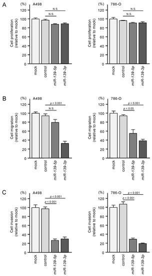 Functional assays of cell proliferation, migration, and invasion following ectopic expression of miR-139-5p and miR-139-3p in RCC cell lines A498 and 786-O. N.S.: not significant. (A) Cell proliferation was assessed using XTT assays. Data were collected 72 h after miRNA transfection. (B) Cell migration was assessed using wound healing assays. (C) Cell invasions were determined 48 h after seeding miRNA-transfected cells into chambers using Matrigel invasion assays.