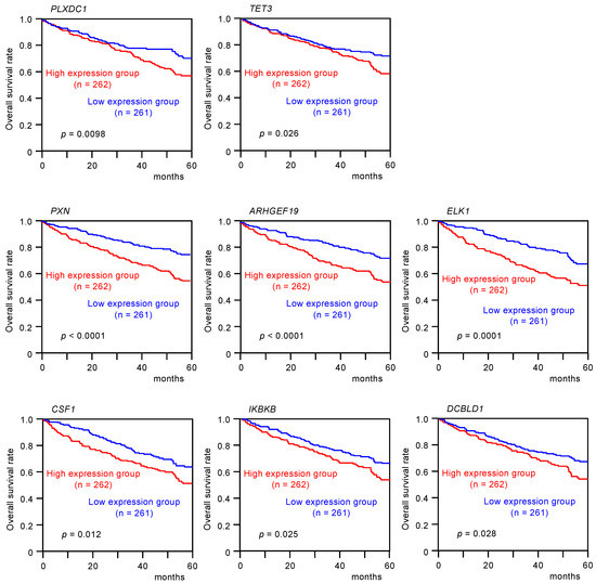 Kaplan–Meier analyses of 5-year overall survival were performed according to high versus low expression of miR-139 target genes. The high expression of two miR-139-5p (PLXDC1 and TET3) and six miR-139-3p target genes (PXN, ARHGEF19, ELK1, CSF1, IKBKB, and DCBLD1) was found to be related to better 5-year overall survival rates of the patients (p < 0.05, Table 1A,B, and Figure 3).