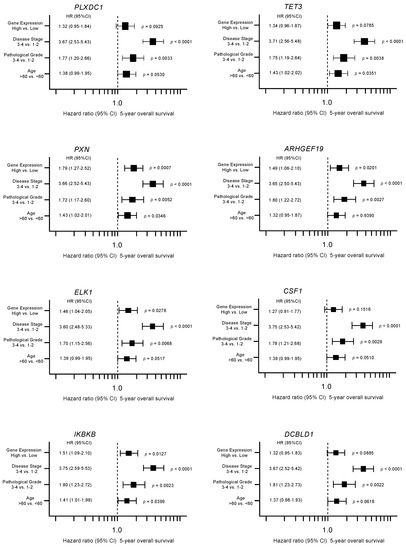 Forest plot showing the results of multivariate analyses of eight genes (PLXDC1, TET3, PXN, ARHGEF19, ELK1, CSF1, IKBKB, and DCBLD1). In addition to the gene expression level, the tumor stage, pathological grade, and age group were evaluated as potential independent factors associated with survival. Numbers of cases per each group are shown in Table S2.