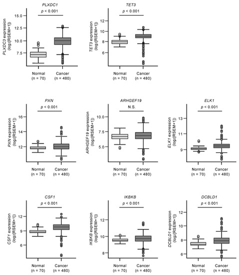 Furthermore, multivariate analyses identified four genes (PXN, ARHGEF19, ELK1, and IKBKB) as independent prognostic factors for patient survival (p < 0.05; Figure 4). We validated the expression levels of these target genes using TCGA-KIRC RNA sequencing dataset. All target genes except ARHGEF19 were upregulated in cancer tissues in this cohort (Figure 5).