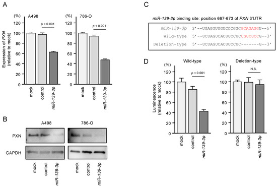 Expression of paxillin (PXN) was regulated directly by miR-139-3p in RCC cells. (A) Expression of PXN mRNA was significantly suppressed in miR-139-3p-transfected A498 and 786-O cells (48 h after transfection). Expression of GAPDH was used as an internal control. (B) Expression of PXN protein was reduced in miR-139-3p-transfected RCC cells (48 h after transfection). GAPDH was used as a loading control. (C) The TargetScanHuman database predicted one putative miR-139-3p-binding site in the 3’-UTR of PXN. (D) Dual-luciferase reporter assays showed decreased luminescence activity in RCC cells co-transfected with miR-139-3p together with a vector harboring the “wild-type sequence”. Normalized data were calculated as Renilla/firefly luciferase activity ratios. N.S.: not significant.