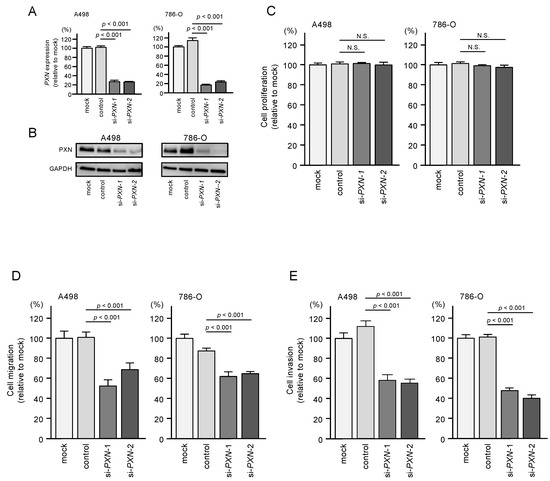 Effects of PXN knockdown on cell proliferation, migration, and invasion in RCC cells. (A,B) Expression of PXN was successfully reduced after siRNA transfection in RCC cells. (C) Cell proliferation was determined by XTT assays. N.S.: not significant. (D) Cell migration was determined by wound healing assays. (E) Cell invasion was determined by Matrigel invasion assays.
