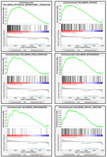 We performed gene set enrichment analysis to determine differentially expressed genes between the high and low PXN expression groups of the TCGA-KIRC cohort. In support of the functional assays using siRNAs, the most enriched signaling pathway in the high PXN expression group was “epithelial–mesenchymal transition” (Figure 8 and Table S3). Other significantly enriched pathways (FDR q-value < 0.05) were “hypoxia”, “KRAS signaling”, “myogenesis”, “angiogenesis”, and “apical junction”, supporting the hypothesis that PXN is related to the metastatic ability of cancer cells (Figure 7 and Table S2).