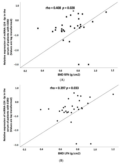 Correlation of the relative expression of miRNA-124-3p in the serum of ESRD patients on hemodialysis (HD) (cases) with (A) BMD in RFN and (B) BMD in LFN. The relative expression of miRNA-124-3p is log transformed. BMD, bone mineral density; LFN, left femoral neck; RFN, right femoral neck; ESRD, end-stage renal disease; miRNA, microRNA