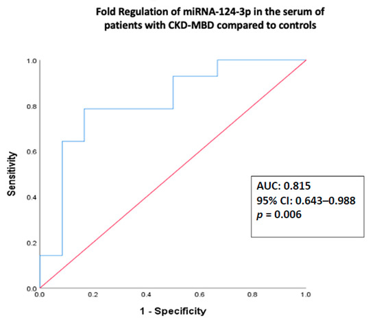 The associated area under the curve (AUC) of the relative serum expression of miRNA-124-3p on cases compared to controls was 0.815 (95% CI 0.643–0.988, p = 0.006) (Figure 3), showing a sensitivity of 78% and specificity of 83% in identifying ESRD patients with low BMD in the osteoporotic range (T-score < −2.5 at FN and/or LS). The respective AUC for miRNA-21-5p was 0.488 (95% CI 0.234–0.742, p = 0.13) and for miRNA-23a-3p was 0.607 (95% CI 0.339–0.875, p = 0.447).