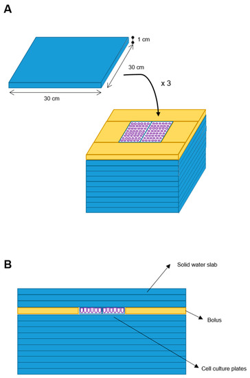 We designed a phantom for treatment delivery constituted by 10 square slabs of solid water (RW3, PTWTM) with 30 × 30 × 1 cm (W-L-H) size each, with equivalent-to-water attenuation properties in the used MV (Megavolt) photon energy range. Two cell culture plates (W-L-H: 10 × 4 × 1 cm each) were placed above the center of the tenth overlaid slab, with a water-equivalent bolus placed all around such plates to assure lateral electronic equilibrium. Three further solid water slabs (RW3) were posed above the cell cultures to assure a cells’ depth larger than the build-up depth (Figure 1).