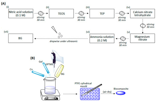 Chitosan (419419), gelatin (G9382), and 3-Glycidyloxypropyl trimethoxysilane (GPTMS) (435171) were purchased from Sigma-Aldrich, Darmstadt, Germany. Triethyl phosphate, tetraethyl orthosilicate, nitric acid solution, calcium nitrate tetrahydrate, magnesium nitrate, and ammonia solution were purchased from Merck, Darmstadt, Germany. Bioactive glass (BG) with the composition of SiO2 64, CaO 27, MgO 4, and P2O5 5 mol% was prepared by sol–gel method as shown in the Figure 1A according to previous literature [39,41].