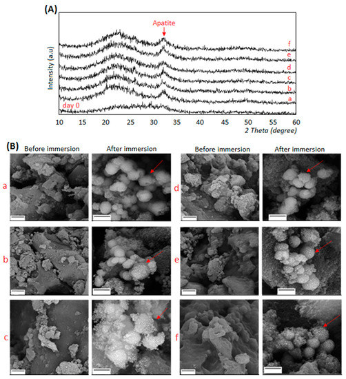 XRD spectra (A, upper panel) and SEM images (B, lower panel) of composites before (=day 0) and after immersion in SBF solution for 14 days. Apatite formation was confirmed for all the tested specimens by both XRD that showed typical apatite peaks and SEM whose images demonstrated the presence of crystals aggregates (indicated by the red arrows). SEM magnifications: 15,000× (before immersion) and 20,000× (after immersion), bar scale = 2 μm. a: BG-Cn-GPTMS10, b: BG-Cn-GPTMS20, c: BG-Gel-GPTMS10, d: BG-Gel-GPTMS20, e: BG-Cn-Gel-GPTMS10, f: BG-Cn-Gel-GPTMS20. BG=Bioactive glass, Cn=chitosan, Gel=gelatin.