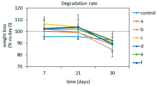 Ideal composites aimed at small bone defects healing such as injectable pastes should be bioresorbable and biodegradable, but at the same time, they must be able to withstand in the injured site until the formation of the new tissue. Accordingly, the degradation of the composites was here tested over a 30 days period in physiological conditions (SBF immersion, 37 °C) by means of specimens’ weight loss in comparison with day 0 (intended as prior to SBF immersion) values that were considered as 100%. Results are reported in Figure 3.