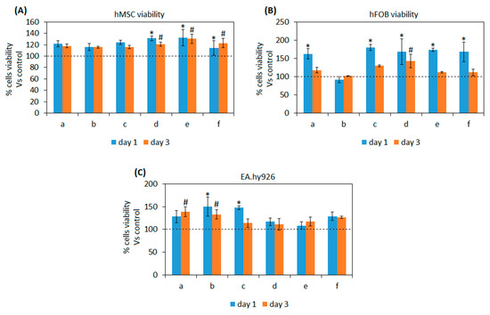 In general, test composites demonstrated to be more cell friendly in comparison with the 100% BG controls (that were considered as 100% viability) for all the tested cells lines by reporting values >100% (indicated by the dashed lines). In detail, hMSC viability (Figure 4A) was significant in comparison with control for composites d-e-f after 1 day in direct contact (p < 0.05, indicated by *) as well as after 3 days (p < 0.05, indicated by #). Osteoblasts progenitors hFOB (Figure 4B) reported a significantly higher viability in comparison with controls after day 1 for a-c-d-e-f composites (p < 0.05, indicated by *) but only for d after 3 days (p < 0.05, indicated by #). Finally, endothelial EA.hy296 cells (Figure 4C) showed a significant increase in terms of viability in comparison with control for b-c composites after 1 day (p < 0.05, indicated by *) while a-b resulted significant after 3 days (p < 0.05, indicated by #).