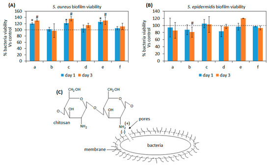 As expected, results were strictly related to the composites formulation and in particular with the presence of chitosan. In fact, the best results were achieved by the composite b containing BG-chitosan-GPTMS wt20%: the biofilm contamination was comparable to the bulk 100% BG in water paste control materials for SA at both time points (Figure 5A, p > 0.05) while when SE infection was considered a significant reduction was observed after 3 days (Figure 5B, p < 0.05 vs. controls, indicated by #). Chitosan antibacterial properties are well known and it was demonstrated to be effective mostly towards Gram-positive bacteria but also to inhibit the biofilm formation of Gram-negative bacteria and some fungi [70]. Basically, the mechanism behind this is due to the electrostatic interaction occurring between the positive charged groups of the chitosan and the negatively charged outer membrane of bacteria that causes irreversible damage of the latter. In fact, chitosan structure is characterized by the presence of amino groups that can bind with the lipopolysaccharides and the proteins that are found within the bacteria membrane (schematized in Figure 5C); so, due to the above-mentioned interactions a change in the bacteria membrane occurs leading to the formation of pores that causes intracellular components and nutrients leaking as well as membrane lysis [71].
