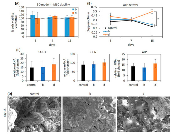 After the evaluation of specimens’ cytocompatibility and antibacterial activity, the following composites were selected as the most promising and used for further analysis: b (BG-Cn-GPTMS20) and d (BG-Gel-GPTMS20). Accordingly, they were used to test cells’ ability to grow within specimens’ pores simulating a 3D matrix [48,49]. First, hMSC were mixed in a defined number (1 × 106) into 50 µL of a liquid collagen matrix (PureCol™ EZ Gel solution, from Sigma); then, the collagen loading cells were slowly added dropwise into the composites at room temperature (liquid phase) to completely fill their pores. Afterwards, composites filled with cells were moved into the incubator at 37 °C to allow collagen gelation phase to act as temporary support for cells growing in a 3D matrix. The use of the collagen matrix can represent a drawback for the stem cells differentiation evaluation as it can act as a pro-osteogenic factor; however, it was necessary to maintain the cells within the pores of the scaffolds in a proper number thus avoiding cell leakage through the pores. Finally, composites were submerged with 1 mL of fresh medium and cultivated for 7 and 15 days. At each time-point cell metabolism was evaluated by the Alamar blue assay as previously described. The 100% BGs were used as control and considered 100% viability while test values were normalized towards them.