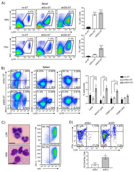 For blood and spleen neutrophil isolations, on the first day mice were administered 5 × 106 cfu of shScr, shIDO-ST or HBSS volume equivalent followed by 2 × 106 cfu on the second and 1 × 106 cfu on the third consecutive day intravenously via the retro-orbital vein. Blood and spleens were collected after euthanization 48 or 72 h after the third ST administration. For peritoneal neutrophil isolation, 4 × 107 cfu of shScr, shIDO-ST or HBSS volume equivalent was injected into the intraperitoneal cavity of mice followed by 2 × 107 cfu on the second day. Three hours after the second administration, mice were sedated and 5 mL of HBSS was injected into the intraperitoneal cavity; the abdomen was massaged to dislodge cells into the fluid. Then, the HBSS with cells was removed using a large gauge needle. The solution was then overlaid on top of a 0/52/62.5/78 percent Percoll gradient and centrifuged at 700× g for 30 min without acceleration or brake. Individual layers were removed by transfer pipette to individual tubes for washing. Wright’s staining (Wright’s Giemsa, WG16-500 mL, Sigma-Aldrich, Carlsbad, CA, USA) was performed on 10–25 µL of washed layers that were smeared and allowed to dry on slides before fixation in 100% methanol.