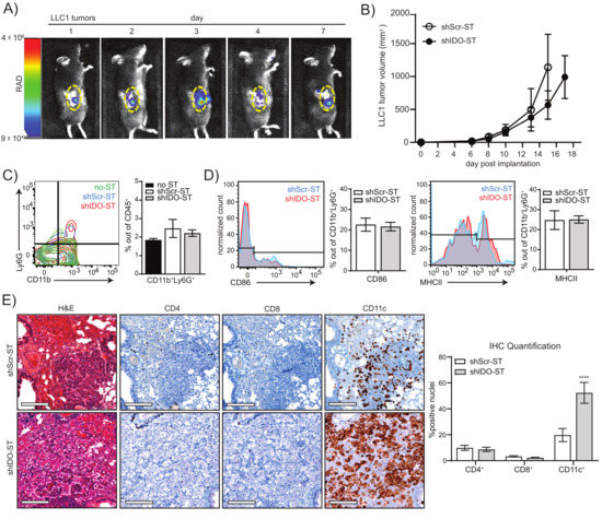 We next examined the effects of low-dose shIDO-ST treatment on immune cell infiltration in a KrasLSL-G12D/+; Trp53R270H/+(KP) mouse model of NSCLC, where Kras and p53 mutations can be activated in the lung by intranasal administration of adenovirus encoding Cre recombinase (Ad-cre) [41]. Following published timelines for tumor growth, we treated mice with shScr-ST or shIDO-ST (2 months post-Ad-cre administration) at low dose (1 × 106 cfu) [22,35] and isolated lungs from treated groups 24 h later. H&E staining of lung sections revealed small cancer foci surrounded by hyperplastic growth of transformed lung cells (Figure 2E, H&E panels). Staining of sections with primary antibodies against CD4, CD8 and CD11c revealed that shIDO-ST treatment significantly increased infiltration of CD11c+ cells (p < 0.0001) in transformed lung tissue (as determined by IHC), while CD4+ and CD8+ cells remained unchanged and were largely confined to blood vessels with little infiltration into tumor tissue (Figure 2E). As the KP model showed inconsistent lung transformation with large variation in size of tumor foci post-administration of the Ad-cre, we chose to employ the LLC1 model for the remainder of our studies, which is the only highly reproducible lung cancer model utilizing immunocompetent mice [56].