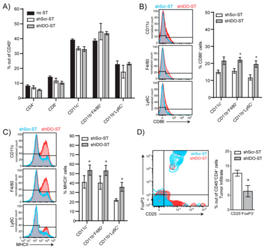 Frequency and phenotypes of tumor-infiltrating immune cells after shIDO-ST treatment. Mice (n = 4) with LLC1 tumors (> 80 mm3) were treated with three consecutive doses of 1 × 106 cfu of shScr-ST or shIDO-ST and tumors were processed for flow cytometry 48 h after the third treatment. (A) Histograms depicting no change in frequencies of CD4+, CD8+, CD11c+, CD11b+F4/80+ and CD11b+Ly6C+ cells out of CD45+ tumor-infiltrating cells following ST treatment. (B) Frequency of CD86+ cells out of myeloid cell types (CD11c+, CD11b+F4/80+, and CD11b+Ly6C+ cells). Bar graphs show quantification of flow cytometry results. (C) Frequency of MHCII+ cells out of myeloid cell types (CD11c+, CD11b+F4/80+, and CD11b+Ly6C+ cells). Bar graphs show quantification of flow cytometry results. (D) Frequency of Tregs (CD25+FoxP3+ out of CD45+CD4+ cells). Bar graph shows quantification of flow cytometry results. Unpaired t-test. (A–D) * p < 0.05.