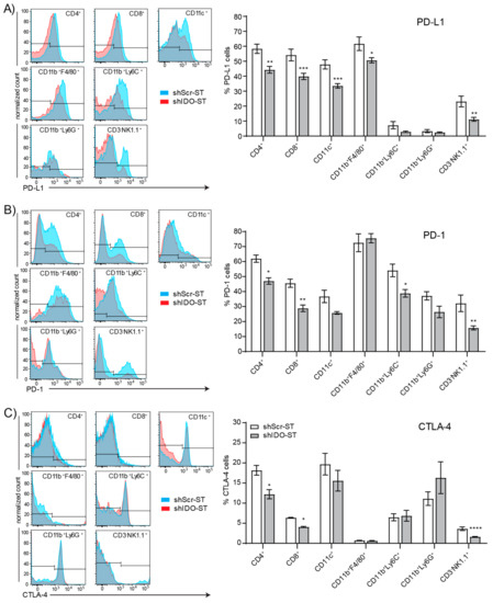 3.4. Sub-Therapeutic shIDO-ST Treatment Suppresses Checkpoint Protein Expression in Splenic Immune Subsets