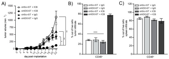 Tumor growth and total immune infiltrate after combination treatment with shScr or shIDO-ST and antibodies targeting PD-1 and CTLA-4. Mice with palpable LLC1 tumors were treated with three consecutive doses of 1 × 106 cfu of shScr or shIDO-ST combined with immune checkpoint blockade (ICB, PD-1 and CTLA-4 antibodies) or IgG equivalent. PD-1 was administered at a dose of 200 µg and CTLA-4 was administered at a dose of 75 µg every three days until most groups reached maximum tumor growth. n = 4–10 mice per group. (A) Tumors were measured 3 times weekly and volume in mm3 is presented as a tumor growth curve. Statistical significance between shIDO-ST + ICB and shIDO-ST + IgG is shown for days 17, 20, 22, and 24 using a Mann–Whitney test. (B) Tumors and (C) spleens were excised 48 h after the third ST treatment (24 h after the second ICB or IgG treatment) and processed for flow cytometry. Frequencies of infiltrating CD45+ immune cells are shown in bar graphs. * p < 0.05, ** p < 0.01, **** p < 0.0001.