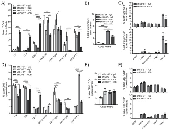 A more in-depth analysis of specific immune subsets, however, revealed changes in the infiltration of multiple cell types in both the tumor and spleen. The shIDO-ST + ICB treated tumors have significantly higher numbers of tumor-infiltrating CD4+ and CD8+ T cells compared to all other treatment groups (p < 0.0001), as well as significantly higher numbers of CD11c+ cells (Figure 6A). Tumor-infiltrating CD11b+F4/80+ cells remained significantly lower in shIDO-ST + IgG and shIDO-ST + ICB groups compared to shScr-ST groups indicating that this effect is due to shIDO-ST treatment alone, whereas ICB alone decreased CD11b+Ly6C+ in both shScr and shIDO-ST groups. Tumor-infiltrating NK cells were significantly decreased only in the shIDO-ST + ICB treatment group (Figure 6A). ICB treatment in both shScr-ST and shIDO-ST groups increased Tregs out of total CD4+ T cells consistent with reports in human tumor treatment [59,60]; however, shIDO-ST treatment in combination with ICB prevented the level of Treg increase seen in the shScr-ST + ICB treatment group (Figure 6B). These increased Treg after ICB treatment may explain the trend in increased tumor growth in the shScr-ST + ICB treated group. CD4+ and CD8+ T cells were analyzed for expression of activation markers including CD27 (promotes T cell survival and enhances priming) [61], CD62L (rapidly lost from T cells after specific antigen stimulation) [62], granzyme B (effector, cytotoxic factor) [63], interferon gamma (IFNγ, multi-cell immune modulator secreted by activated T cells) [64] and NK1.1 (in conjunction with CD3 positivity marks natural killer T cells (NKT)) [65]. Out of CD4+ and CD8+ cells in tumors, most markers remained unchanged between shScr-ST + ICB and shIDO-ST + ICB groups except for NK1.1, which was significantly decreased in shIDO-ST + ICB treated tumors compared to shScr-ST + ICB treated tumors (CD4+ p = 0.0059, CD8+ p = 0.0027) (Figure 6C). However, due to the overall increase in CD4+ and CD8+ T cells in shIDO-ST + ICB-treated mice, these data denote a greater number of activated, intratumoral T cells compared to other groups. In the spleen, ICB treatment combined with shScr-ST decreases CD4+ and CD8+ T cells compared to IgG combined with either shScr-ST or shIDO-ST treatment; however, the combination of ICB with shIDO-ST prevents this decrease. In addition, shIDO-ST combined with ICB treatment alone increases CD11c+ cells and decreases CD11b+F4/80+ macrophages and CD11b+Ly6G+ neutrophils. Interestingly, shScr-ST with ICB increases the presence of CD3-NK1.1+ cells significantly in the spleen while shIDO-ST plus ICB combination prevents this increase (Figure 6D). Tregs remained unchanged in the spleen (Figure 6E) and, similar to results observed in tumor, activation markers for T cells also remained unchanged (Figure 6F).