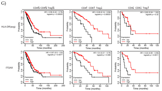 KMplot.com [45] was used to create Kaplan–Meier plots using human data sets. Lung adenocarcinomas (n = 513) were selected from the pan-cancer RNA-seq dataset for analysis of overall survival comparing high and low expression of CD11c (ITGAX) and MHCII (averaged expression of HLA-DR, HLA-DRB1, HLA-DRB5, and HLA-DRB6). Three restriction scenarios were used: (1) no restriction of subtypes, no restriction of cellular content, (2) no restriction of subtypes, restriction to samples with enriched CD4 and CD8 content and decreased Treg content, and (3) no restriction of subtypes, restriction to samples with decreased CD4 and CD8 content and enriched Treg content.