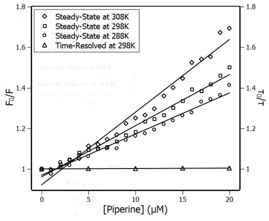 Left ordinate Stern–Volmer plots at three temperatures, 288 K, 298 K and 308 K, and right ordinate time-resolved fluorescence lifetime plot at 298 K; (NBD) = 4 μM, (piperine) = 0–20 μM. R2 > 0.98.