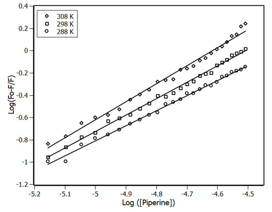 Once the complex formation is proven, the next step was to obtain the binding constant (Ka), applying the binding equilibrium model. The Ka was obtained from the plot of Figure 3 using the double-logarithm equation (Equation (6)), which relates the quenching fluorescence intensities with the total concentration of piperine.