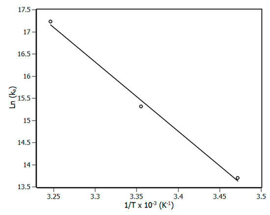 Based on thermodynamic parameters such as ∆S (entropy variation), ∆H (enthalpy variation) and ∆G (Gibbs free variation) it is possible to gain more information about the complex formation and the forces that drive the process [34]. The parameters ∆S and ∆H are obtained from the van’t Hoff plot (Figure 4) according to Equation (7) and ∆G is calculated from Equation (8).
