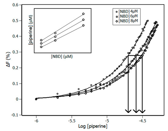 By means of the plot shown in Figure 5, the values of (NBD) and (piperine) for each ΔF was obtained. The inset of Figure 5 shows an example of 3 datasets of the plot of (piperine) versus (NBD) for each ΔF, in which Σνi is obtained from the slope, and (piperine)free is obtained from the y-intercept of the linear function.