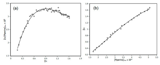 With the parameters Σνi and (piperine)free obtained from IDF, a Scatchard plot was built (Figure 6a), an important source of information about cooperativity. It may reveal if the binding sites of the protein are equivalents or non-equivalents, if there is cooperativity among them as well as if the cooperativity is positive or negative [36,37]. Figure 6a shows a line profile with negative concavity, pointing out positive cooperativity. Although Scatchard’s plot reveals the occurrence of cooperativity, it does not identify the number of sites that NBD has. To complement this information, it is necessary to use the Hill’s plot to disclose additional features such as the number of binding sites (n) and the binding constants (Kb) [38,39]. The Hill’s plot is shown in Figure 6b, whose parameters n and Kb were obtained by Equation (11). The parameter h is called the Hill coefficient, which indicates the type of cooperativity. The Hill coefficient can assume values of >1, <1 and =1 indicating positive cooperativity, negative cooperativity and non-cooperativity, respectively.