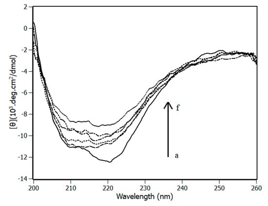 Circular dichroism spectra were recorded at 288, 298 and 308 K on a Jasco J-815 spectropolarimeter model DRC-H (Jasco, Easton, MD, USA) equipped with a demountable quartz cell with a 0.01 cm optical path length. The CD spectra were recorded from the 200 to 260 nm range with a scan rate of 20 nm/min and a spectral resolution of 0.1 nm. For each spectrum, 15 accumulations were performed. The molar ratios of NBD and piperine were 1:0, 1:2.5, 1:5, 1:7.5, 1:10 and 1:12.5, and the buffer spectrum was subtracted. The ellipticity θ collected in millidegrees was converted to mean residue ellipticity [θ] (deg.cm2.dmol−1) using Equation (4).