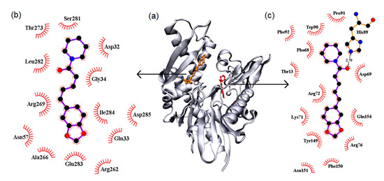 - Wallace, A.C.; Laskowski, R.A.; Thornton, J.M. LIGPLOT: A program to generate schematic diagrams of protein-ligand interactions. Protein Eng. Des. Sel. 1995, 8, 127–134. [Google Scholar] [CrossRef]