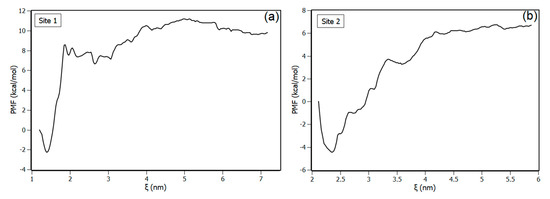 The two most promising binding sites predicted by molecular docking were explored by the umbrella sampling method. Figure 9 shows the potential of mean force profiles resulting from the complex dissociation obtained for the two binding sites. According to the results, both binding site profiles presented the minimum of energy at the configuration predicted by molecular docking, which indicated that the two configurations are stable. Potential of mean force (PMF) profiles also revealed that the energetic barrier to unbind piperine from the binding sites is higher in site 1 than in site 2. The standard free energy for the binding sites (∆Gpred) was determined from WHAM analyses, with (−45 ± 5) kJ/mol for binding site 1 and (−41.8 ± 4) kJ/mol for binding site 2. Although the PMF profiles revealed that the binding sites are distinct in terms of the energetic barrier profile to dissociate piperine, the binding free energy values determined with WHAM analyses are very close considering the statistical errors, corroborating the results obtained from Hill’s plot that showed equivalence between the binding affinities of both sites.